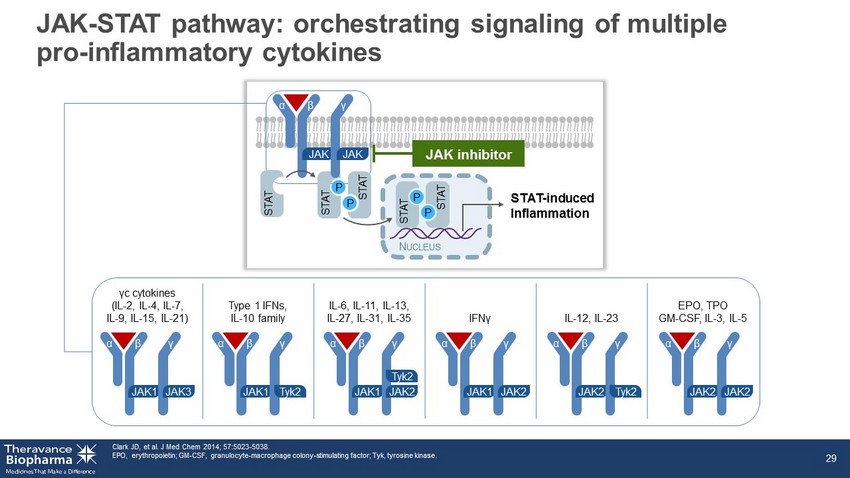 STAT - induced Inflammation α N UCLEUS STAT P STAT P STAT P STAT P STAT JAK β γ JAK JAK inhibitor JAK - STAT pathway: orchestrating signaling of multiple pro - inflammatory cytokines Clark JD, et al. J Med Chem 2014; 57:5023 - 5038. EPO, erythropoietin; GM - CSF, granulocyte - macrophage colony - stimulating factor; Tyk, tyrosine kinase. 29 γ c cytokines (IL - 2, IL - 4, IL - 7, IL - 9, IL - 15, IL - 21) Type 1 IFNs, IL - 10 family IL - 6, IL - 11, IL - 13, IL - 27, IL - 31, IL - 35 IFN γ IL - 12, IL - 23 EPO, TPO GM - CSF, IL - 3, IL - 5 α JAK1 β γ JAK3 α JAK1 β γ Tyk2 α JAK1 β γ JAK2 Tyk2 α JAK1 β γ JAK2 α JAK2 β γ Tyk2 α JAK2 β γ JAK2