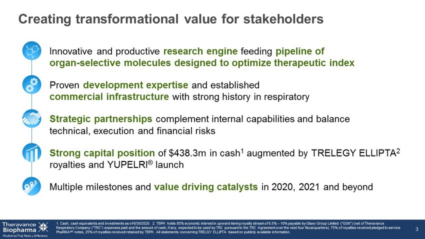 Forward - looking statements 2 Under the safe harbor provisions of the U . S . Private Securities Litigation Reform Act of 1995 , the company cautions investors that any forward - looking statements or projections made by the company are subject to risks and uncertainties that may cause actual results to differ materially from the forward - looking statements or projections . Examples of forward - looking statements in this presentation may include the Company’s strategies, plans and objectives, the Company’s regulatory strategies and timing of clinical studies (including the data therefrom), the potential characteristics, benefits and mechanisms of action of the Company’s product and product candidates, the potential that the Company’s research programs will progress product candidates into the clinic, the Company’s expectations for product candidates through development, the Company's expectations regarding its allocation of resources, potential regulatory approval and commercialization (including their differentiation from other products or potential products), product sales or profit share revenue and the Company’s expectations for its 2020 operating loss, excluding share - based compensation and other financial results . The company’s forward - looking statements are based on the estimates and assumptions of management as of the date of this presentation and are subject to risks and uncertainties that may cause the actual results to be materially different than those projected, such as risks related to the impacts on the COVID - 19 global pandemic on our business, delays or difficulties in commencing, enrolling or completing clinical studies, the potential that results from clinical or non - clinical studies indicate the Company’s compounds or product candidates are unsafe or ineffective, risks that product candidates do not obtain approval from regulatory authorities, the feasibility of undertaking future clinical trials for our product candidates based on policies and feedback from regulatory authorities, dependence on third parties to conduct clinical studies, delays or failure to achieve and maintain regulatory approvals for product candidates, risks of collaborating with or relying on third parties to discover, develop, manufacture and commercialize products, and risks associated with establishing and maintaining sales, marketing and distribution capabilities with appropriate technical expertise and supporting infrastructure, current and potential future disagreements with Innoviva, Inc . and TRC LLC, the uncertainty of arbitration and litigation and the possibility that an arbitration award or litigation result could be adverse to the Company . Other risks affecting Theravance Biopharma are in the company's Form 10 - Q filed with the SEC on August 10 , 2020 , and other periodic reports filed with the SEC .