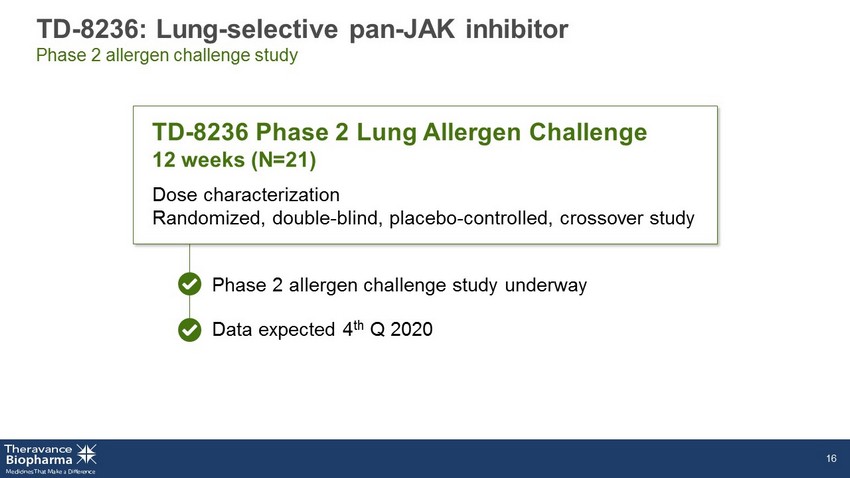 TD - 8236: Phase 1 clinical trial design Parts A & B completed September 2019; Part C data expected 4Q 2020 PART C MoA Biomarkers (Moderate - to - severe asthmatics) • MoA biomarkers to be assessed in target patient population • Goal: build confidence in compound, MoA and dose in early - development FeNO, fractional exhaled nitrous oxide; MAD, multiple ascending dose; SAD, single ascending dose. 15 4000µg N = 16 active/8 Placebo Study open and enrolling All cohorts: N = 6 active/2 Placebo 4500µg 500µg 1500µg 150µg 50µg 1 2 3 4 5 6 7 D 1500 µg 1 2 3 4 5 6 7 D 150µg 500µg 1500µg 1 2 3 4 5 6 7 D 1 2 3 4 5 6 7 D 1 2 3 4 5 6 7 D PART A PART B SAD ( Healthy volunteers) Safety and PK MAD ( Mild asthmatics) Safety, PK, and PD (FeNO)