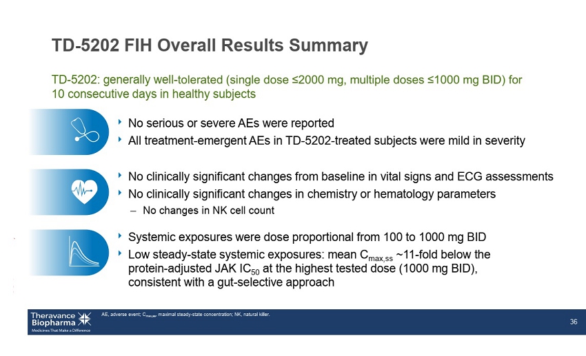 TD - 5202 FIH Overall Results Summary ‣ No serious or severe AEs were reported ‣ All treatment - emergent AEs in TD - 5202 - treated subjects were mild in severity AE, adverse event; C max,ss , maximal steady - state concentration; NK, natural killer. 36 TD - 5202: generally well - tolerated (single dose ≤2000 mg, multiple doses ≤1000 mg BID) for 10 consecutive days in healthy subjects ‣ Systemic exposures were dose proportional from 100 to 1000 mg BID ‣ Low steady - state systemic exposures: mean C max,ss ~11 - fold below the protein - adjusted JAK IC 50 at the highest tested dose (1000 mg BID), consistent with a gut - selective approach ‣ No clinically significant changes from baseline in vital signs and ECG assessments ‣ No clinically significant changes in chemistry or hematology parameters – No changes in NK cell count