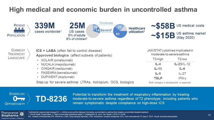 High medical and economic burden in uncontrolled asthma *Asthma that requires high - dosage ICS + LABAs to prevent the disease from being uncontrolled) or asthma that remains uncontrolle d despite treatment. 1. World Health Organization; 2. https://www.aafa.org/asthma - facts/; 3. Sadatsafavi, M., et al. Can Respir J 2010;17:74 - 80. ICS, inhaled corticosteroids; IFN, interferon; LABA, long - acting β2 agonists; LTRA, leukotriene receptor antagonist; OCS, oral corticosteroid; T2, type 2; TSLP, thymic stromal lymphopoietin. 14 16 14 Severe* Moderate US asthma market (May 2020) 61 25 US cases 8% of adults 8% of children 2 Healthcare utilization 3 25M ~$15B P ATIENT P OPULATION C URRENT T REATMENT L ANDSCAPE S TRATEGIC O PPORTUNITY TD - 8236 Potential to transform the treatment of respiratory inflammation by treating moderate - to - severe asthma regardless of T2 phenotype, including patients who remain symptomatic despite compliance on high - dose ICS ICS + LABA (often fail to control disease) Approved biologics (affect subsets of patients) US medical costs ~$58B T2 - high T2 - low IL - 4 IL - 23 /IL - 12 IL - 13 IL - 6 IL - 5 IL - 27 TSLP IFN - γ Bold: biologics in development or approved. JAK/STAT cytokines implicated in moderate - to - severe asthma • XOLAIR (omalizumab) • NUCALA (mepolizumab) • CINQAIR (reslizumab) • FASENRA (benralizumab) • DUPIXENT (dupilumab) Step - up for severe asthma: LTRAs, tiotropium, OCS, biologics cases worldwide 1 339M