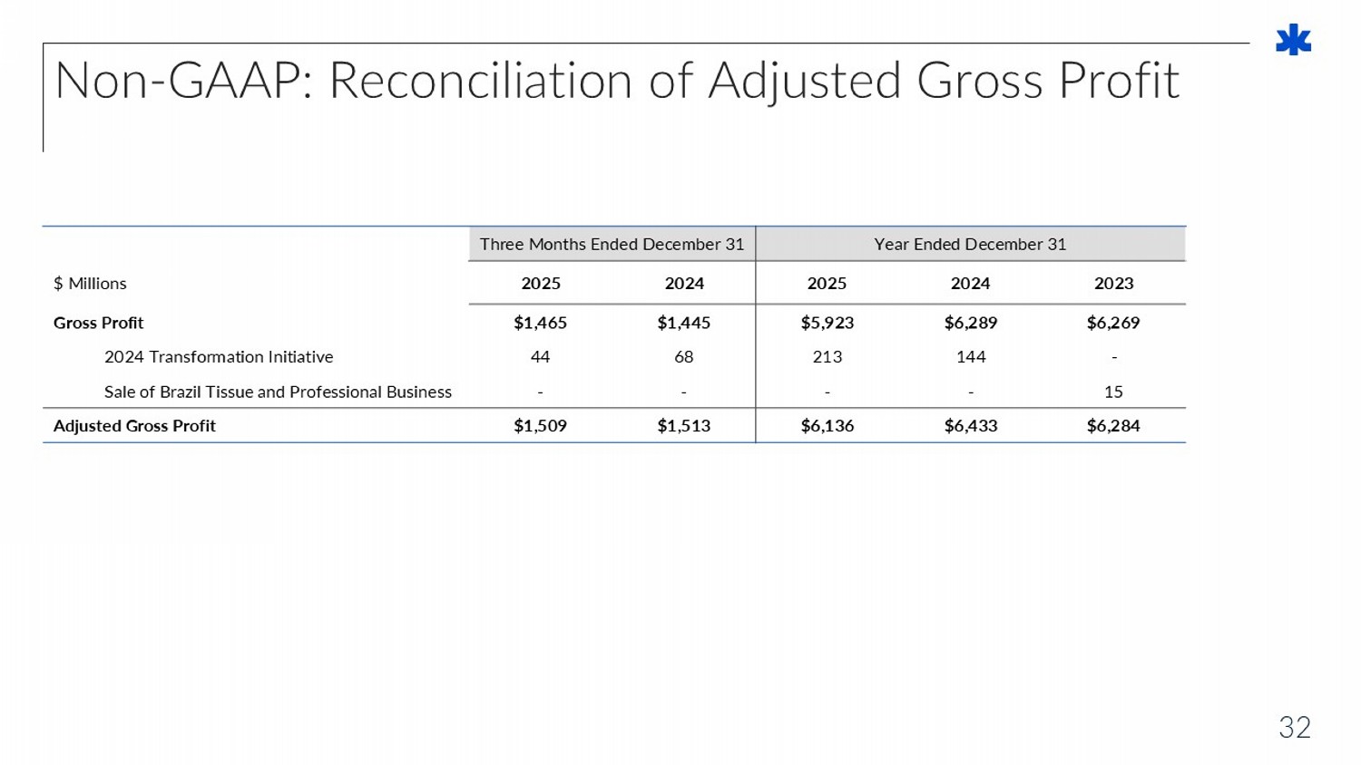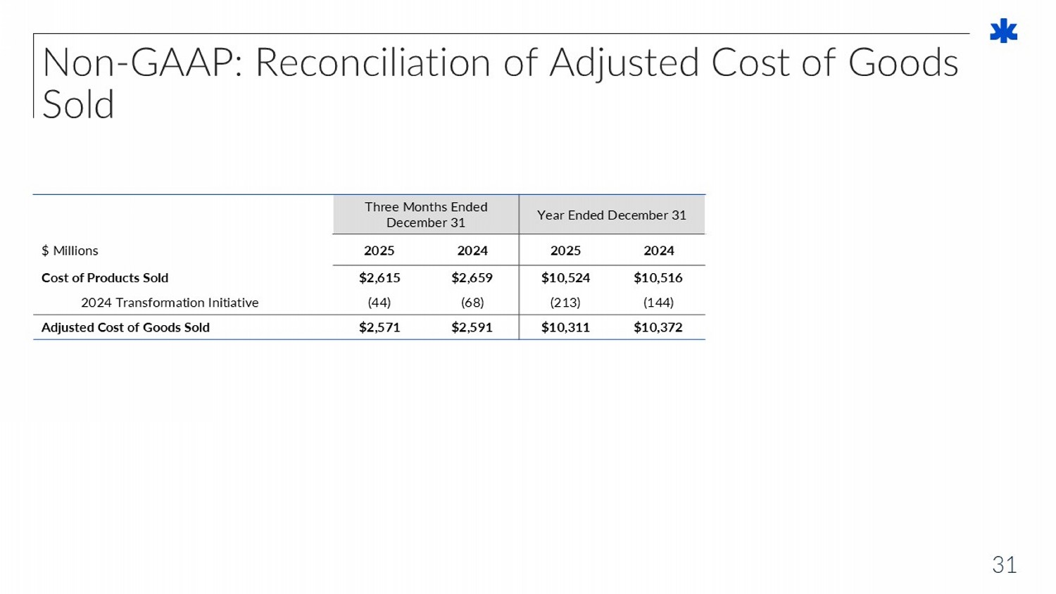31非公认会计原则:调整后的已售商品成本调节截至12月31日的年度截至12月31日的三个月2024202520242025百万美元10,516美元10,524美元2,659美元2,615美元的已售产品成本(144)(213)(68)(44)2024年转型倡议10,372美元10,311美元2,591美元2,571美元调整后的已售商品成本