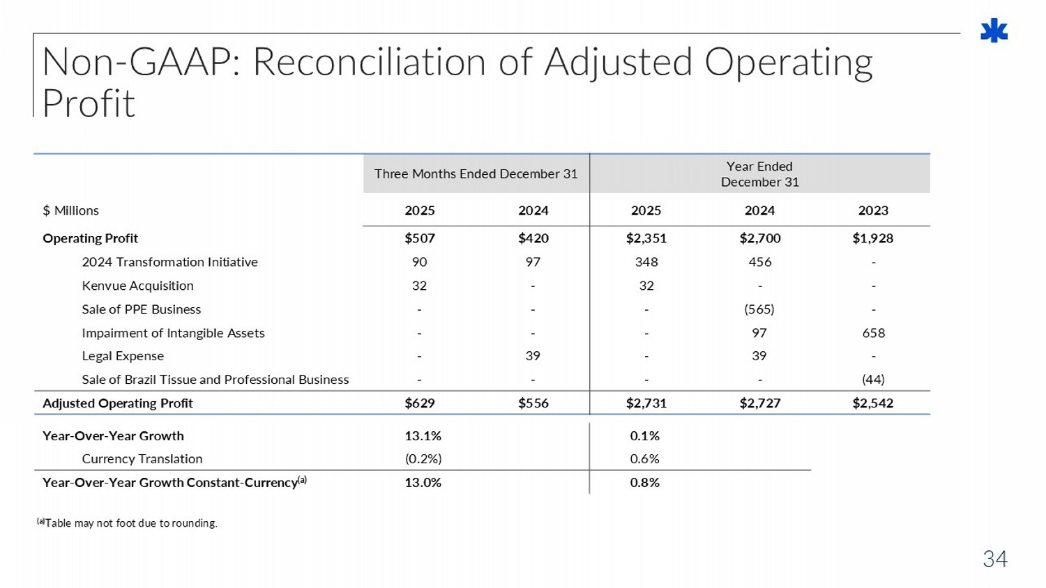 33 Non-GAAP:调整后的RSG & A截至2023年12月31日止年度的对账20232025美元百万美元3,615美元3,528美元营销、研究和一般费用(1,139)(1,110)广告和促销-(142)2024年转型倡议-(32)Kenvue收购(15)-出售巴西纸巾和专业业务2,461美元2,244美元调整后的RSG & A