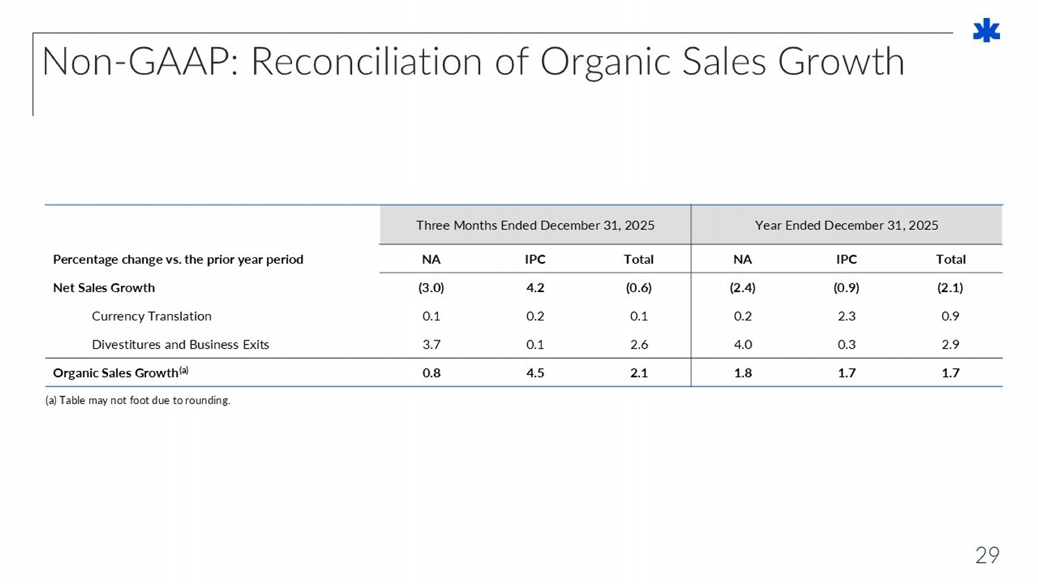 29 Non-GAAP:截至2025年12月31日止年度的有机销售增长调节截至2025年12月31日止三个月的总IPC NA总IPC NA与上年同期相比的百分比变化(2.1)(0.9)(2.4)(0.6)4.2(3.0)净销售增长0.9 2.3 0.2 0.10.2 0.1货币换算2.9 0.34.0 2.6 0.13.7剥离和业务退出1.7 1.7 1.8 2.14.5 0.8有机销售增长(a)(a)由于四舍五入,表格可能不符合规定。