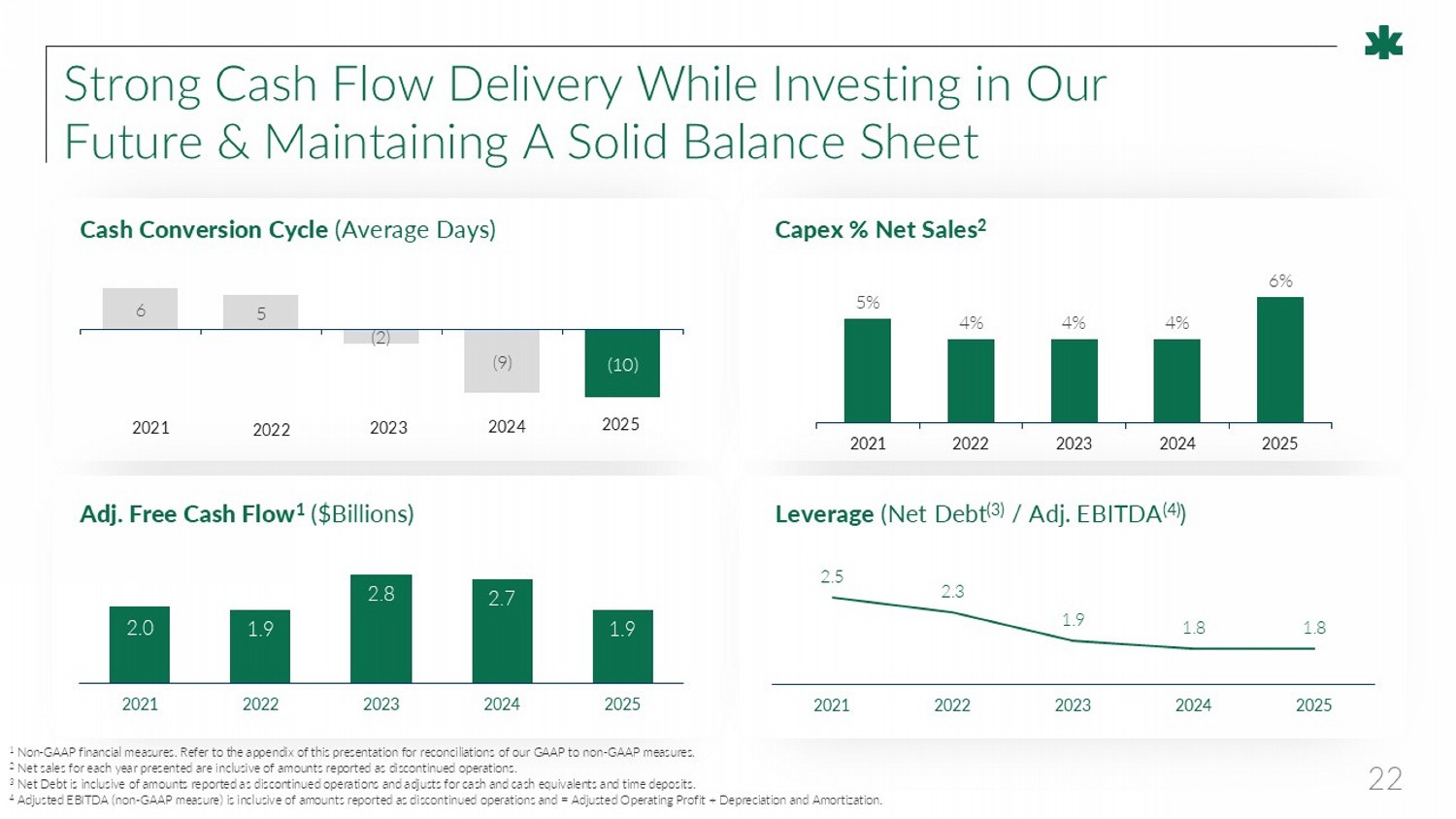 强劲的现金流交付,同时投资于我们的未来&保持稳健的资产负债表现金转换周期(平均天数)Capex %净销售额2调整后自由现金流1(十亿美元)杠杆(净债务(3)/调整后EBITDA(4))2.0 1.9 2.8 2.7 1.9 20212022022022022023202420252.5 2.3 1.9 1.8 1.8 2021202022022023202420255% 4% 4% 4% 6% 202120220220232024202565(2)(9)(10)123452021202202202202320242025221非公认会计准则财务指标。请参阅本演示文稿的附录,了解我们的GAAP与非GAAP措施的对账情况。2列报的每一年的净销售额包括报告为已终止经营业务的金额。3净债务包括报告为已终止经营业务的金额,并根据现金和现金等价物和时间进行调整。4调整后EBITDA(非GAAP衡量标准)包括报告为已终止经营业务的金额,并=调整后的营业利润+折旧和摊销。