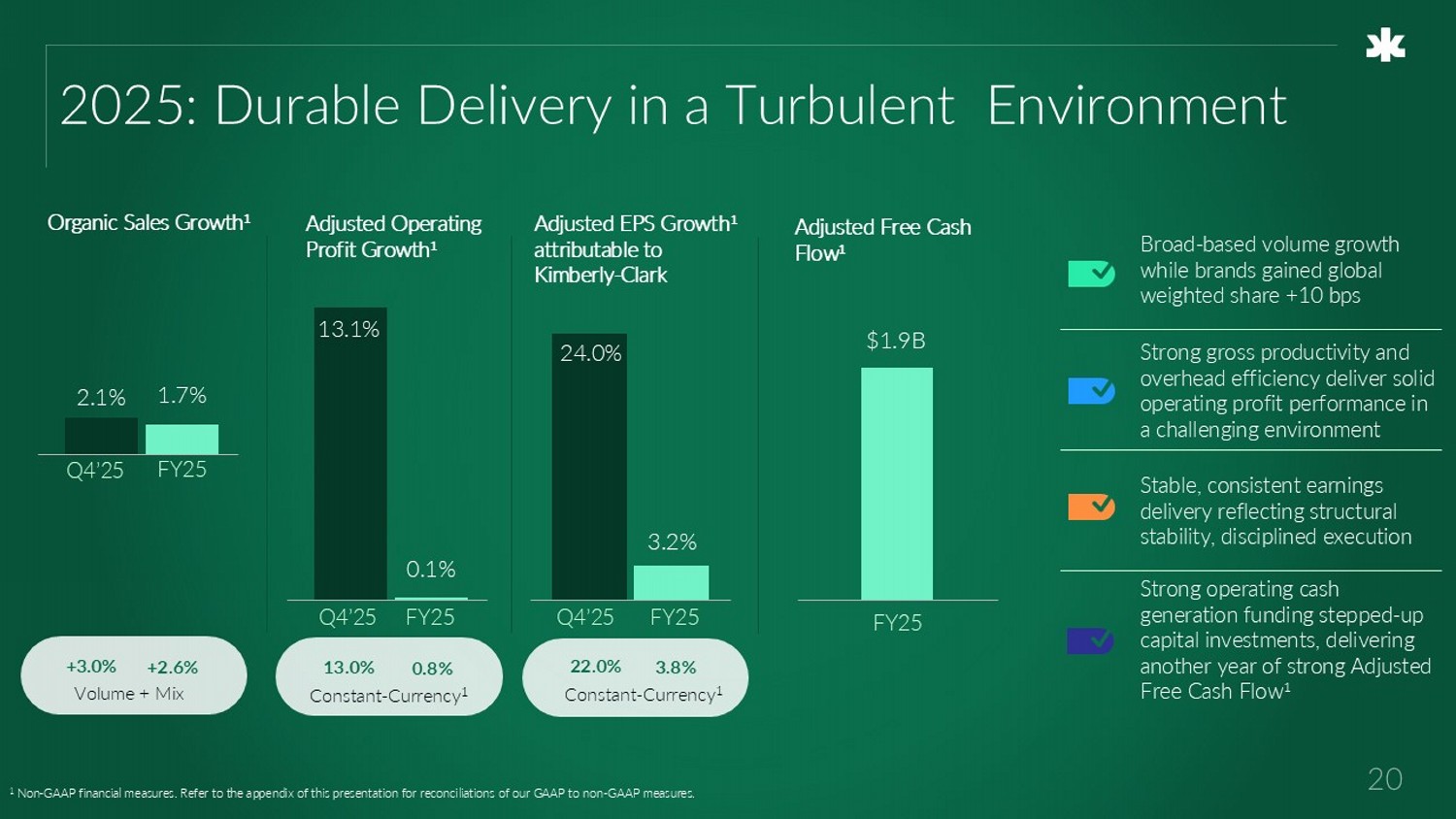 13.1% 0.1% 2.1% 1.7% Q4’25广泛的销量增长,同时品牌获得全球加权份额+ 10个基点强劲的毛利率和间接费用效率在充满挑战的环境中提供了稳健的运营利润表现稳定,持续的收益交付反映了结构稳定性,严格的执行强劲的运营现金产生资金加强了资本投资,实现又一年强劲的调整后自由现金流1有机销售增长12025:动荡环境中的持久交付调整后营业利润增长1 Q4’25调整后每股收益增长1归属于金佰利-克拉克24.0% 3.2% Q4’25调整后自由现金流1 FY25 $ 1.9B 1非公认会计准则财务指标。有关我们的GAAP与非GAAP措施的对账,请参阅本演示文稿的附录。13.0%不变-货币1不变-货币1 FY25 FY25 FY25 0.8% 22.0% 3.8% + 3.0%成交量+混合+ 2.6%