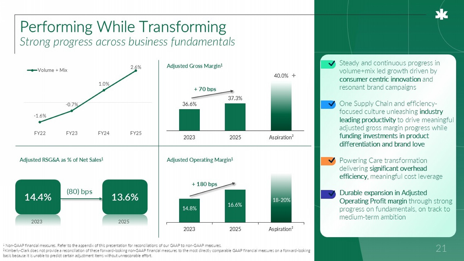 14.8% 16.6% 18-20% 20232025 Aspiration ² + 180个基点36.6% 37.3% 40.0% 20232025 Aspiration ² + 70个基点+执行,同时转变跨业务基本面的强劲进展-1.6%-0.7% 1.0% 2.6% FY22 FY23 FY24 FY25销量+组合调整后毛利率114.4% 13.6%(80)个基点调整后的RSG & A占净销售额的百分比1调整后营业利润率120232025在以消费者为中心的创新和共振的品牌活动的推动下,销量+组合引领增长稳步持续进步One Supply Chain和注重效率的文化释放行业领先的生产力,以推动有意义的调整后毛利率进步,同时为产品差异化和品牌热爱的投资提供资金。Powering Care转型提供了显着的间接费用效率和有意义的成本杠杆,通过基本面的强劲进展,调整后的营业利润率可持续扩张,并有望实现中期目标1非公认会计准则财务指标。有关我们的GAAP与非GAAP措施的对账,请参阅本演示文稿的附录。2金佰利-克拉克没有提供这些前瞻性非GAAP财务指标与前瞻性基础上最直接的可比较GAAP财务指标的对账,因为它无法在没有不合理努力的情况下预测某些调整项目。