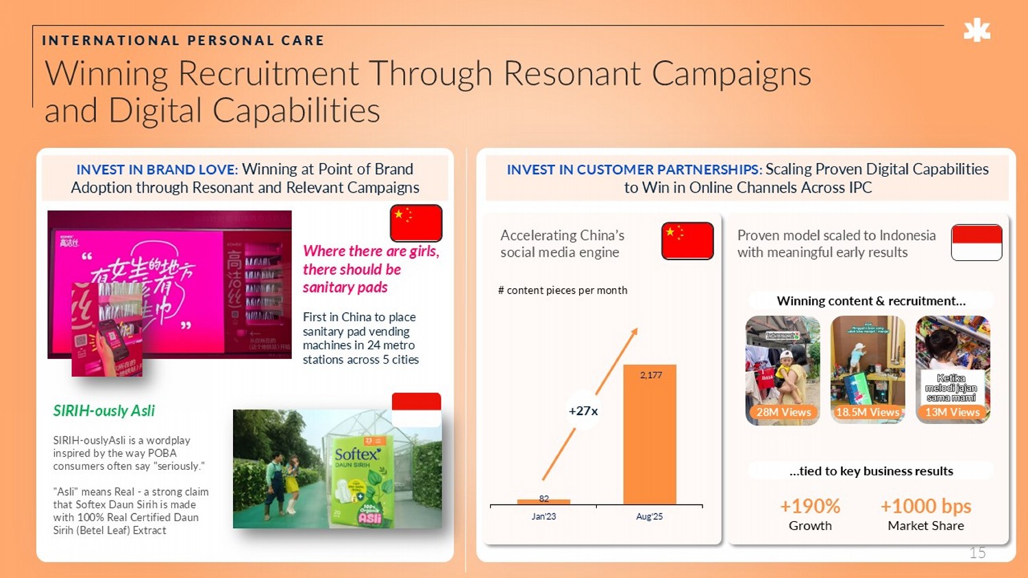 通过共鸣活动和数字能力赢得招聘国际个人护理哪里有女孩,就应该有卫生巾在中国先行在5个城市的24个地铁站放置卫生巾自动售货机SIRIH-ously ASLI SIRIH-ouslyASLI是一种受POBA消费者常说的“认真”方式启发的文字游戏。“Asli”的意思是真实的-强烈主张The Softex Daun Sirih is made with 100% real certified Daun Sirih(Bettel Leaf)extract investment in brand love:winning at point of brand adoption through resonant and relevant campaigns accelerating China‘s social media engine # content pieces per month 822,177 Jan’23 Aug'25 + 27 x 28m views 18.5m views 13m proven model scaled to Indonesia with effective early results + 1000 bps market share + 190% growth winning content & recruitment……invested with key business resul