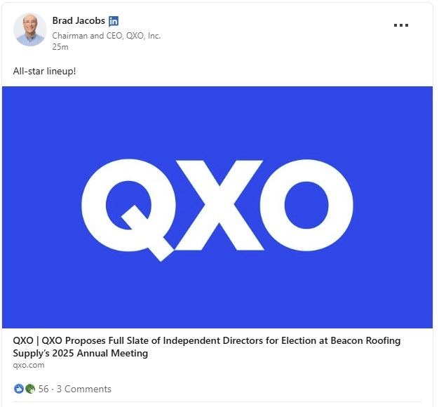 QXO董事长兼首席执行官布拉德·雅各布斯(Brad Jacobs)表示:“我们正在提议一批高素质的独立董事提名人,他们在为大型上市公司的股东创造价值方面非常精明。”“如果当选,我们的提名人将让Beacon的股东直接发声,主张对QXO的提议进行独立评估。”