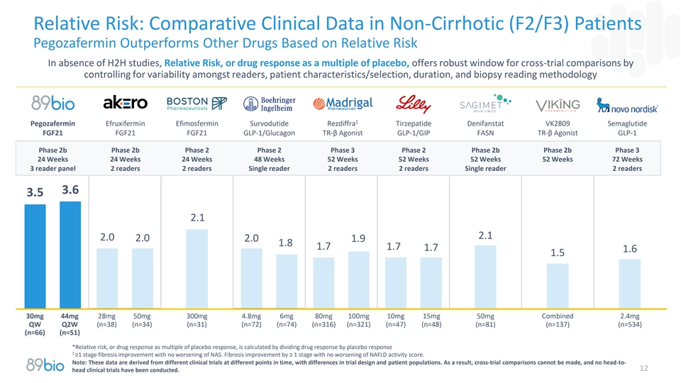相对风险:基于在没有H2H研究、相对风险或作为安慰剂倍数的药物反应的情况下的相对风险,Pegozafermin在非肝硬化(F2/F3)患者中的比较临床数据优于其他药物,通过控制读者之间的变异性、患者特征/选择、持续时间、和活检读取方法1 Pegozafermin Efruxifermin Efimosfermin Survodutide Rezdiffra Tirzepatide Denifanstat VK2809 Semaglutide FGF21 FGF21 FGF21 GLP-1/胰高血糖素TR-β激动剂GLP-1/GIP FASN TR-β激动剂GLP-1 2b期2b期2b期2期3期2b期2b期3期24周24周48周52周52周52周52周52周72周3读写器面板2读写器2读写器单读写器2读写器2读写器单读写器2读写器3.6 3.5 2.1 2.0 2.0 2.0 2.0 1.9 1.8 1.7 1.7 1.7 1.7 1.6 1.5 30mg44mg28mg50m100mg 10mg 15mg 50mg联合2.4mg QW Q2W(n = 38)(n = 34)(n = 31)(n = 72)(n = 74)(n = 316)(n = 321)(n = 47)(n = 48)(n = 81)(n = 137)(n = 534)(n = 66)(n = 51)*相对风险,或药物反应作为安慰剂反应的倍数,通过将药物反应除以安慰剂反应1 ≥ 1阶段纤维化改善且NAS没有恶化来计算。纤维化改善≥ 1阶段,NAFLD活性评分无恶化。注:这些数据来源于不同时点的不同临床试验,在试验设计和患者人群方面存在差异。因此,无法进行跨试验比较,也没有进行过头部对12的临床试验。