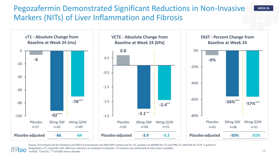 第24周Pegozafermin显示肝炎的非侵入性标志物(NITs)显着减少和纤维化CT1-与VCTE的绝对变化-与FAST的绝对变化-与第24周基线的百分比变化(ms)第24周基线(kPA)第24周基线00% 0.8 0.5-6-6 %-20-20 %-0.5-40-40 %-1.5-60-60 %******-2.5 -70 -56%***-80**-57% -2.4***-3.1***-92-100-3.5-80 %安慰剂30mg QW 44mg Q2W安慰剂30mg QW 44mg Q2W安慰剂30mg QW 44mg Q2W n = 57 n = 61 n = 49 n = 61 n = 66 n = 51 n = 61 n = 66 n = 51安慰剂调整-86-64安慰剂调整-3.9-3.2安慰剂调整-50 %-51 %来源:全分析集为CT1的FibroScan和PRO-C3评估和MRI-PDFF分析集,CT1和PRO-C3的MMRM分析,VCTE的ANCOVA。与基线相比,患者被指定为减少≥ 80毫秒的CT1应答者。在可用的地点进行CT1分析。18*p < 0.05,**p < 0.01,***p < 0.001对比安慰剂。
