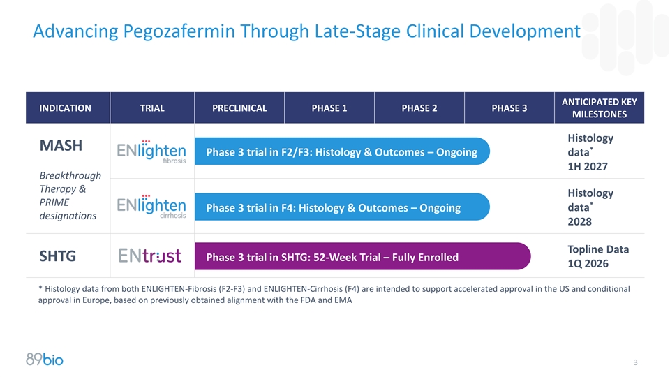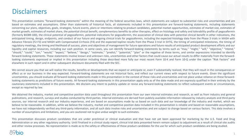 免责声明本演示文稿包含联邦证券法含义内的“前瞻性陈述”,这些陈述受到重大风险和不确定性的影响,并基于估计和假设。除历史事实陈述外,本演示文稿中包含的所有陈述均为前瞻性陈述,包括关于我们的计划、目标、目标、战略、未来事件、与候选产品相关的计划或意图、潜在市场机会、市场规模估计、市场增长估计、市场份额估计、潜在临床益处、与其他疗法的互补益处、对pegozafermin(原BIO89-100)的组织学和安全性和耐受性的影响、pegozafermin的临床潜力、pegozafermin的潜在适应症、临床数据与其他适应症的潜在临床益处的关联、预期的时间、设计、终点,并进行我们未来和正在进行的pegozafermin临床试验,包括MASH伴晚期纤维化(F2-F3)和MASH伴代偿性肝硬化(F4)3期试验的预期组织学数据和SHTG 3期试验的预期顶线结果、预期里程碑的时间安排、监管会议的时间安排、成功的时间和可能性、管理层对未来运营的计划和目标以及预期产品开发努力的未来结果以及我们的流动性和资本资源,包括我们的现金状况。在某些情况下,您可以通过“可能”、“可能”、“将”、“目标”、“打算”、“应该”、“可能”、“可以”、“将”、“预期”、“相信”、“设计”、“估计”、“预测”、“潜在”、“计划”或这些术语的否定词来识别前瞻性陈述,以及旨在识别前瞻性陈述的类似表述。这些陈述涉及已知和未知的风险、不确定性和其他因素,这些因素可能导致我们的实际结果与本演示文稿中明示或暗示的前瞻性陈述存在重大差异,包括那些在“风险因素”标题下以及此类报告和随后提交给SEC的其他披露文件中更全面地描述了我们最近的10-K表格和10-Q表格的那些陈述。我们无法向您保证,我们将实现我们预期或预期的结果、收益或发展,或者,即使已基本实现,它们将导致后果或以预期的方式影响我们或我们的业务。前瞻性陈述不是历史事实,反映了我们目前对未来事件的看法。鉴于存在重大不确定性,您应该在这些风险和不确定性的背景下评估本演示文稿中所做的所有前瞻性陈述,而不是过分依赖这些前瞻性陈述作为对未来事件的预测。本演示文稿中的所有前瞻性陈述仅适用于作出之日,并受到本演示文稿中包含的警示性陈述的明确限定。除法律要求外,我们不打算公开更新或修改任何前瞻性陈述以反映后续事件或情况。我们从我们自己的内部估计和研究,以及行业和一般出版物,以及第三方进行的研究、调查和研究中获得了本演示文稿中使用的行业、市场和竞争地位数据。内部估计来自行业分析师和第三方来源发布的公开信息、我们的内部研究和我们的行业经验,并基于我们根据这些数据以及我们对行业和市场的了解做出的假设,我们认为这些假设是合理的。此外,虽然我们认为本演示文稿中包含的行业、市场和竞争地位数据是可靠的,并且基于合理的假设,但我们没有独立核实任何第三方信息,所有这些数据都涉及风险和不确定性,并且可能会基于各种因素而发生变化。这些数据涉及许多假设和限制,请注意不要对这些估计给予不应有的权重。本演示文稿讨论了正在进行临床前或临床评估且尚未获得美国食品和药物管理局或任何其他监管机构批准上市的候选产品。在临床研究报告中最终确定之前,此处提供的临床试验数据仍将受到临床现场审计和其他审查过程的调整。对于这些候选产品的安全性或有效性,不作任何陈述,以供正在研究这些候选产品的用途。1