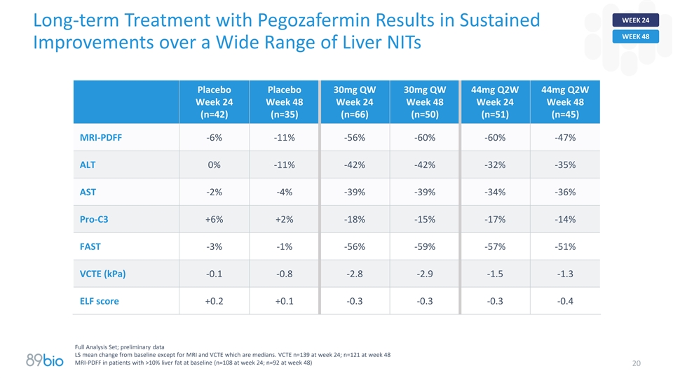 第24周Pegozafermin在非侵入性标志物(NITS)方面表现出显着改善纤维化ELF-与FIB-4的绝对变化-与PRO-C3的绝对变化-与第24周的第24周的基线变化百分比第24周的基线0.3 0.26% 0.2 0.15% 0.10.0-5 %-0.1-0.2-15 %-0.3*********-0.3 -0.3***-17% -18%***-0.3***-0.4-0.4-0.5-25 %安慰剂30mg QW 44mg Q2W安慰剂30mg QW 44mg Q2W安慰剂30mg QW 44mg Q2W n = 61 n = 66 n = 51 n = 61 n = 66 n = 51 n = 61 n = 66 n = 51安慰剂调整-0.5-0.5安慰剂调整-0.4-0.4安慰剂调整-25 %-24 %来源:全分析集。报告为LS的NITs意味着与基线相比有变化(绝对或%)19***p < 0.001对比安慰剂。