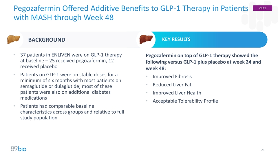 GLP1 Pegozafermin在MASH患者中提供了GLP-1治疗的附加益处至第48周关键结果背景• Enliven的37名患者在GLP-1治疗之上接受GLP-1治疗Pegozafermin显示在基线– 25接受pegozafermin,在第24周与GLP-1加安慰剂相比,有12名以下患者,并在第48周接受安慰剂:•使用GLP-1的患者服用稳定剂量,为期至少6个月•纤维化改善,大多数患者服用•肝脂肪减少的索马鲁肽或度拉鲁肽;这些患者中的大多数还服用了额外的糖尿病•改善了肝脏健康药物•可接受的耐受性概况•患者在各组之间以及相对于完整研究人群具有可比的基线特征21