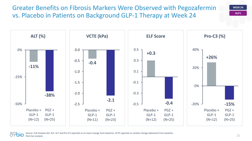 第24周ALT(%)VCTE(kPA)ELF评分pro-C3(%)0.540% 0% 0.0 + 0.3 + 26% 0.3-0.5-0.4-11 % 20%-1.0 0.1-25 %-1.5-0.1 0%-2.0-0.3-38 %-2.1-0.4-50 %-0.5-20 %-2.5-15 %安慰剂+ PGZ +安慰剂+ PGZ +安慰剂+ PGZ + GLP-1 GLP-1 GLP-1 GLP-1 GLP-1 GLP-1 GLP-1 GLP-1 GLP-1 GLP-1 GLP-1(N = 12ELF、ALT和Pro-C3报告为LS相对于基线的平均变化;VCTE报告为相对于基线的中位变化(绝对)。22事后分析
