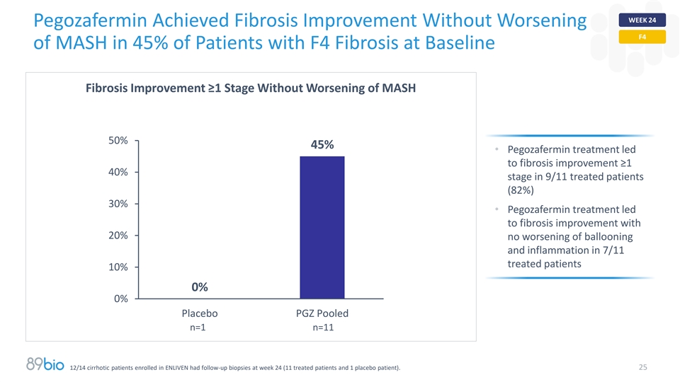 第24周Pegozafermin在基线纤维化改善≥ 1期且MASH没有恶化的情况下实现了MASH的F4的纤维化改善,占45%的F4患者50% 45% 45% • Pegozafermin治疗在9/11接受治疗的患者中导致纤维化改善≥ 140%阶段(82%)30% • Pegozafermin治疗在7/11接受治疗的患者中导致纤维化改善且20%没有球囊和炎症恶化10% 0% 0% 0%安慰剂PGZ汇集n = 1 n = 1112/14入组ENLIVEN的肝硬化患者在第24周进行了随访活检(11名接受治疗的患者和1名安慰剂患者)。25