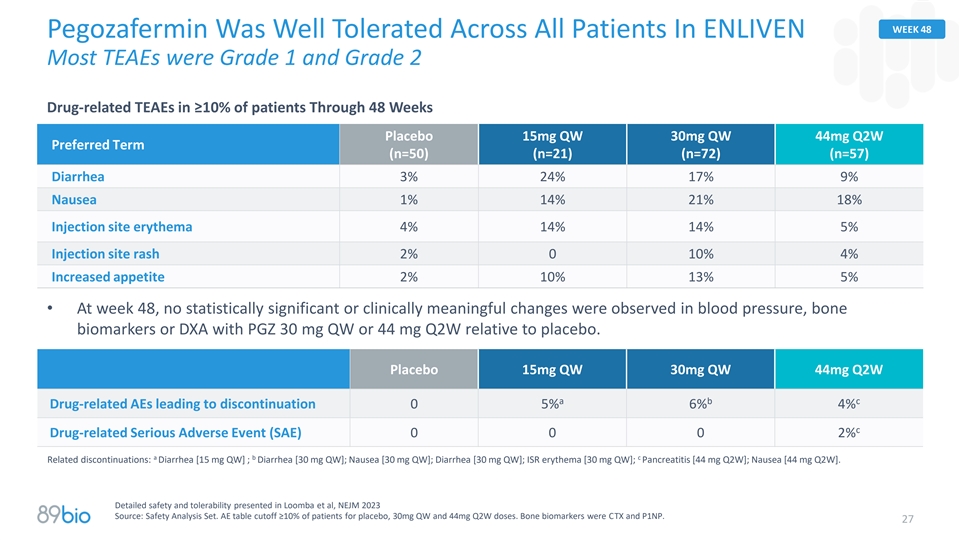 第48周Pegozafermin在Enliven的所有患者中均具有良好的耐受性大多数TEAEs在48周内≥ 10%的患者中为1级和2级药物相关TEAEs安慰剂15mg QW 30mg QW 44mg Q2W优选期限(n = 50)(n = 21)(n = 72)(n = 57)腹泻3% 24% 17% 9%恶心1% 14% 21% 18%注射部位红斑4% 14% 14% 5%注射部位皮疹2% 010% 4%食欲增加2% 10% 13% 5% •第48周,未观察到血压有统计学意义或临床意义的变化,骨生物标志物或DXA与PGZ 30mg QW或44mg Q2W相对于安慰剂。安慰剂15mg QW 30mg QW 44mg Q2W a b c药物相关AEs导致停药05% 6% 4% c药物相关严重不良事件(SAE)0002% a b c相关停药:腹泻[ 15mg QW ];腹泻[ 30mg QW ];恶心[ 30mg QW ];腹泻[ 30mg QW ];ISR红斑[ 30mg QW ];胰腺炎[ 44mg Q2W ];恶心[ 44mg Q2W ]。详细的安全性和耐受性介绍于Loomba等人,NEJM2023来源:安全分析集。AE-table截止≥ 10%的患者采用安慰剂,30mgQW和44mgQ2W剂量。骨生物标志物为CTX和P1NP。27