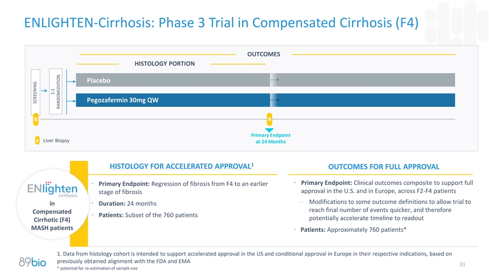 ENLIGHTEN-Fibrosis:F2/F3 MASH组织学结果在组织学和临床结果方面都有成功的潜力• FGF21类似物已证明稳健•在第24周和更长时间范围内从ENLIVEN证明的数据上建立在强大的纤维化回归和NIT纤维化回归基础上• Intercept的REGENERATE 3期试验的临床结果数据令人鼓舞• Pegozafermin在第24周显示纤维化改善并维持——尽管纤维化增量不大,约为10%,第48周Ocaliva的NIT数量®有向临床的趋势(p = 0.04)*结果获益– 3期试验中第12个月的活检可能显示出更强大的效果•第24周PGZ出现~20%的纤维化delta,这是一个好兆头,特别是考虑到有可能•稳健的统计设计,以确定更长的治疗改善的反应具有临床意义的delta • 3期对结果有很好的影响;REGENERATE验证进展为肝硬化是主要的结果事件*这些数据来源于不同时间点的不同临床试验,在试验设计和患者群体方面存在差异。因此,基于与不同试验的比较,无法确保我们正在进行的试验的通读。30