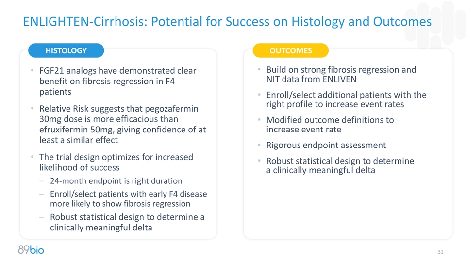 ENLIGHTEN-肝硬化:组织学上的成功潜力和结果组织学结果•建立在强大的纤维化消退和• FGF21类似物已证明来自ENLIVEN获益对F4患者纤维化消退的明确NIT数据•招募/选择更多具有正确特征的患者以增加事发率•相对风险表明,pegozafermin 30mg剂量比•修改结果定义为efruxifermin 50mg更有效,给予at increase事件发生率至少相似效果的信心•严格的终点评估•试验设计针对增加的情况进行优化•稳健的统计设计,以确定成功的可能性具有临床意义的delta – 24个月的终点是正确的持续时间–招募/选择更有可能表现出纤维化消退的早期F4疾病患者–稳健的统计设计,以确定具有临床意义的delta 32