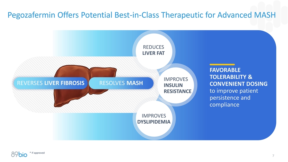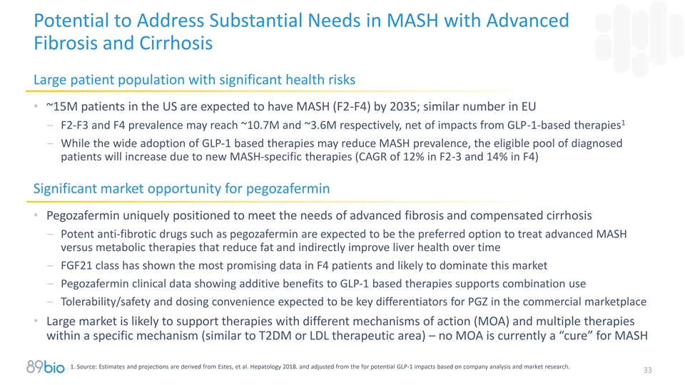 耐受性/安全性和给药便利性预计将成为Pegozafermin在商业市场上的关键差异化因素•患者依从性和持久性的关键驱动因素包括药物耐受性/安全性和便利性,尤其是在无症状疾病适应症中1 – GI不良事件是基于促胰岛素类疗法依从性差的关键原因之一2 •医生在确定药物偏好时非常重视有利的耐受性/安全性特征– Pegozafermin在FGF21类中的市场份额翻了一番,从相似的耐受性/安全性特征到更好的耐受性/安全性特征与依氟西弗明–医生认为Pegozafermin在FGF21类中具有最有利的耐受性/安全性特征•已确认有超过150名MASH处方者的定量研究假设疗效相似,更好的耐受性/安全性导致Pegozafermin在F2-F4患者中的市场份额增加3 •给药便利性为患者和医生带来了有意义的益处—— > 60%的患者更喜欢每两周给药一次而不是每周给药——医生喜欢根据患者背景和偏好选择不同的给药方案(QW和Q2W)来优化治疗1。Gleason PP,et al. J Manag Care Spec Pharm。2024年8月;30(8):860 – 7. doi:10.18553/jmcp.2024.23332;Sikirica MV,et al. Diabetes Metab Syndr Obes。2017;10:403 – 12. doi:10.2147/DMSO.S141235;Zimner Rapuch S,et al. Diabetes Ther。2021年5月;12(5):1553 – 67. DOI:10.1007/s13300-021-01055-5。2.使用GI/Heps(2023)进行89bio市场研究;基于竞争对手Phase 2b数据出版物3数据的比较。Clearview和Trinity Research 404。对150名2型糖尿病患者的一级市场研究,2019年。