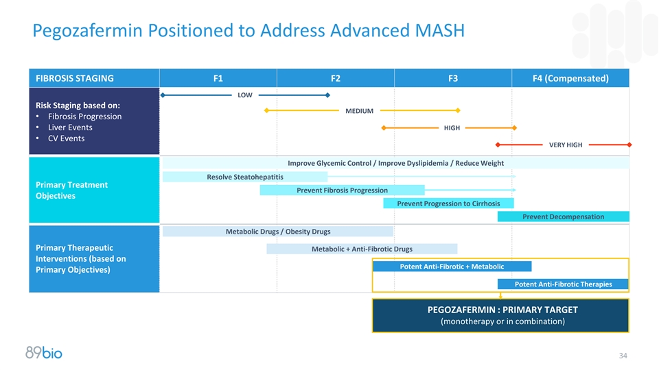 解决晚期纤维化和肝硬化MASH实质性需求的潜力具有重大健康风险的庞大患者群体•预计到2035年,美国将有~1500万患者出现MASH(F2-F4);欧盟1 – F2-F3和F4流行率中的类似人数可能分别达到~10.7m和~3.6m,扣除基于GLP-1疗法的影响——尽管基于GLP-1疗法的广泛采用可能会降低MASH流行率,由于新的MASH特异性疗法(F2-3的CAGR为12%,F4的CAGR为14%),符合条件的确诊患者群体将会增加pegozafermin • Pegozafermin具有重要的市场机会,其独特的定位是满足晚期纤维化和代偿性肝硬化的需求——与代谢疗法相比,pegozafermin等有效的抗纤维化药物有望成为治疗晚期MASH的首选随着时间的推移,它可以减少脂肪并间接改善肝脏健康—— FGF21类在F4患者中显示出最有希望的数据,并可能主导这一市场—— Pegozafermin临床数据显示基于GLP-1的疗法的附加益处支持联合使用——耐受性/安全性和给药便利性预计将成为PGZ在商业市场上的关键差异化因素•大市场可能支持具有不同作用机制(MOA)的疗法和特定机制内的多种疗法(类似于T2DM或LDL治疗领域)——目前没有MOA可以“治愈”MASH1。来源:估算和预测来自Estes,et al. Hepatology 2018.并根据公司分析和市场研究从潜在GLP-1影响调整。33