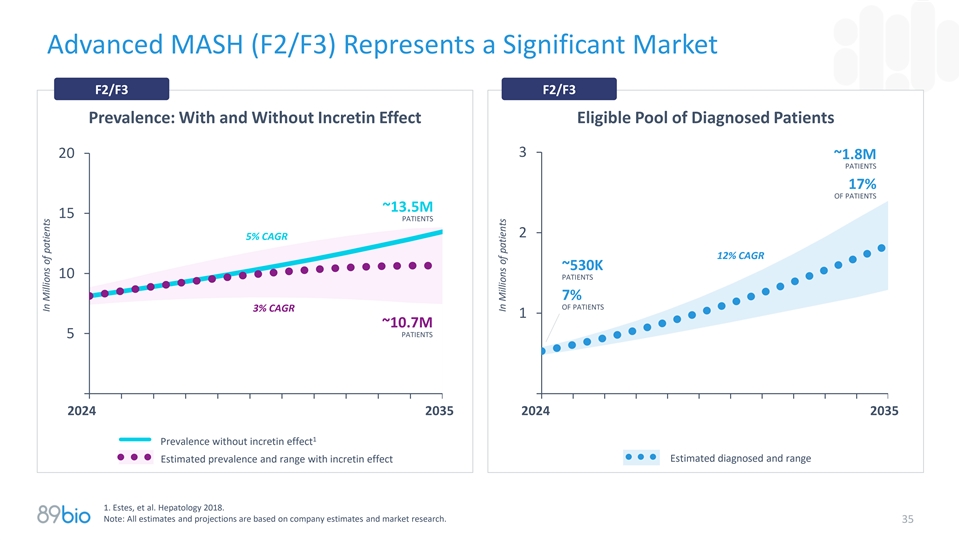 晚期MASH(F2/F3)代表了一个显着的市场F2/F3 F2/F3流行率:有和没有incretin效应的合格诊断患者池3 20~1.8m患者17%的患者~13.5m 15患者25% CAGR12 % CAGR12~530k 10患者7%的患者3% CAGR1~10.7m患者520242035202420351无促胰岛素作用的流行率估计诊断和范围估计有促胰岛素作用的患病率和范围1。Estes,et al. Hepatology 2018。注:所有估计和预测均基于公司估计和市场研究。百万患者中的35人百万患者中的35人