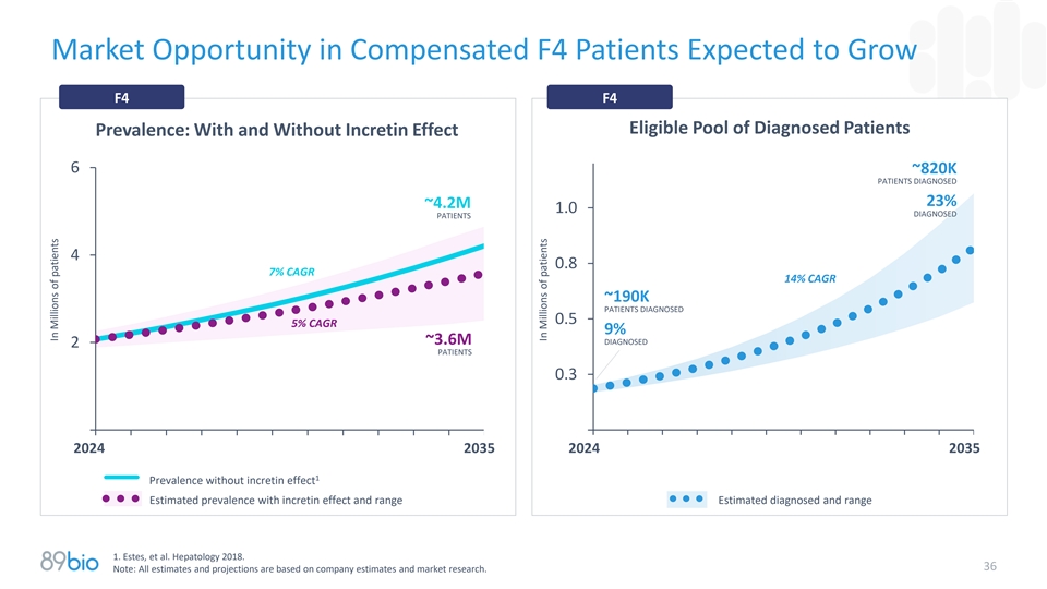 补偿后的预计生长F4患者中的市场机会F4符合条件的确诊患者池患病率:有或没有胰岛素效应6~820K患者诊断23%~4.2m 1.0诊断患者40.87% CAGR14 % CAGR14~190K患者诊断0.55% CAGR9 %~3.6m诊断2患者0.320242035202420351无胰岛素效应的患病率估计有胰岛素效应的患病率和范围估计诊断和范围1。Estes,et al. Hepatology 2018。36注:所有估计和预测均基于公司估计和市场研究。在百万患者中在百万患者中