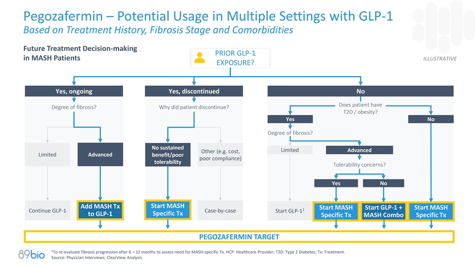 Pegozafermin –基于治疗史、纤维化阶段和合并症的GLP-1在多种环境中的潜在用途未来治疗决策之前GLP-1在MASH患者中的说明性暴露?是的,正在进行的是,停用的否患者是否有纤维化程度?患者为何停药?T2D/肥胖?有没有纤维化程度?没有持续的有限高级其他(例如成本、有限的高级效益/较差的依从性)耐受性耐受性问题?是否添加MASH TX开始MASH开始MASH开始GLP-1 +开始MASH 1继续GLP-1个案启动GLP-1特定TX至GLP-1特定TX MASH组合特定TX PEGOZAFERMIN目标1重新评估6 – 12个月后的纤维化进展,以评估对MASH特异性TX的需求。HCP:医疗保健提供者;T2D:2型糖尿病;TX:治疗。来源:医师访谈;ClearView分析。