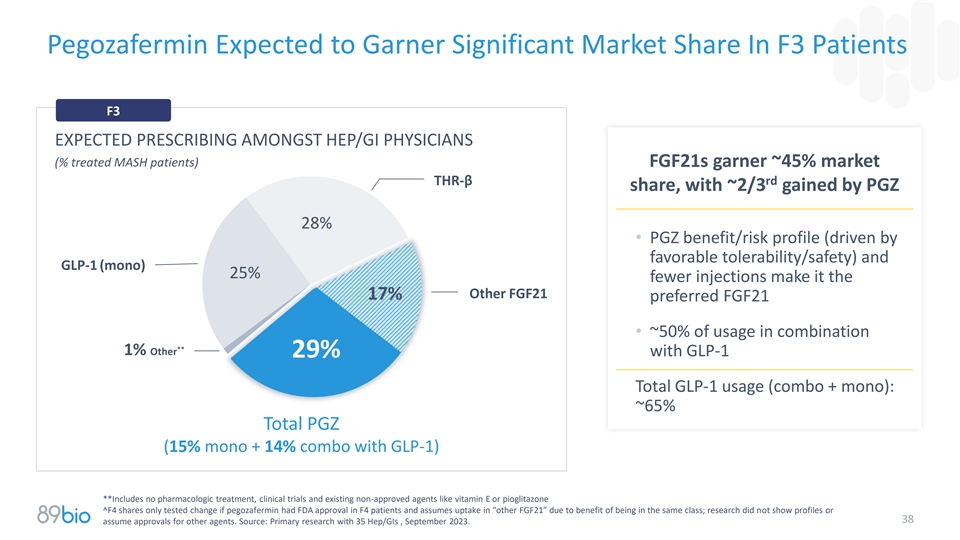 Pegozafermin预计将在F3患者中获得显着市场份额F3预计在HEP/GI医生中开处方(%治疗的MASH患者)FGF21s获得约45%的市场THR-β rd份额,PGZ获得约2/3的份额28% • PGZ益处/风险概况(由良好的耐受性/安全性驱动)和GLP-1(mono)注射减少25%使其成为其他FGF21 17%首选FGF21 •联合使用的约50%**1%其他与GLP-1 29% GLP-1总使用量(combo + mono):~65%总PGZ(15% mono + 14% combo与GLP-1)**不包括药物治疗,临床试验和现有的非批准药物如维生素E或吡格列酮^ F4股价仅在pegozafermin在F4患者中获得FDA批准并因同属一类获益而在“其他FGF21”中承担摄取的情况下测试变化;研究没有显示概况或38假设其他药物获得批准。资料来源:35Hep/GIS的初级研究,2023年9月。