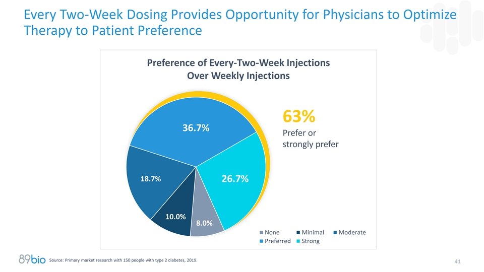 每两周给药为医生提供机会优化治疗患者偏好偏好每两周注射优于每周注射63% 36.7%偏好或强烈偏好18.7% 26.7% 10.0% 8.0%无最小中度首选强来源:对150名2型糖尿病患者的一级市场研究,2019年。41