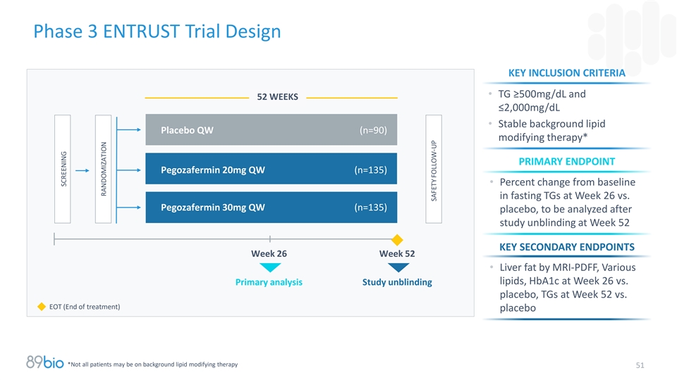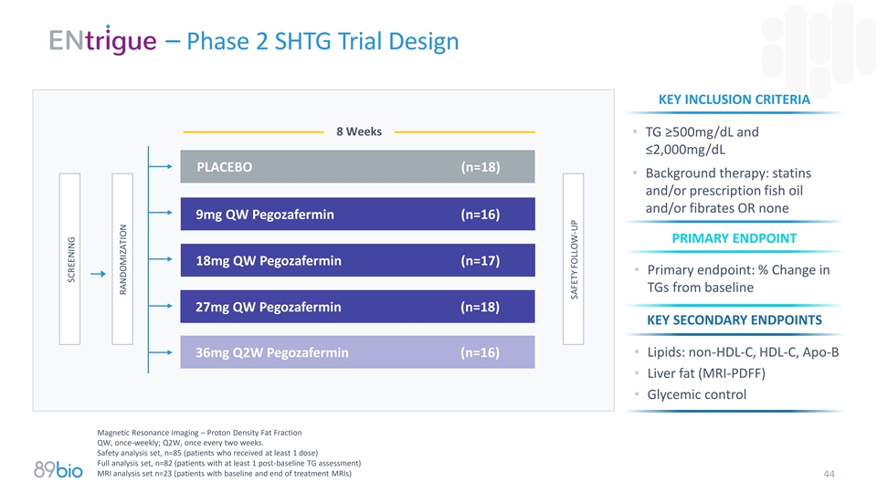 Pegozafermin可能为SHTG顶线结果提供一个重要的新治疗选择,预计2026年第一季度会有大量不断增长的患者群体,存在显着的健康风险;与MASH患者群体重叠• TG水平升高会增加急性胰腺炎的风险,心血管疾病和全因死亡率•有心血管风险因素的患者的心血管(CV)益处与TG降低相关的新证据具有广泛代谢益处的药物的重大市场机会• Pegozafermin具有独特的销售主张这对开药者很有意义–更有效地减少甘油三酯并改善肝脏脂肪和其他新陈代谢指标•分析师一致预期的峰值年销售额估计约为10亿美元(仅美国SHTG)临床项目大幅降低风险• 3期ENTRUST试验完成入组,共369名患者;预计2026年第一季度的顶线数据•将在第52周的研究揭盲后分析第26周空腹TG与安慰剂相比基线百分比变化的主要终点• 2期ENTRIGUE试验显示空腹TG SHTG项目与基线百分比变化的积极数据与MASH项目协同•开发:利用两个项目的安全数据库,以最大限度地减少整个项目的支出•商业:利用销售力量和基础设施成本43