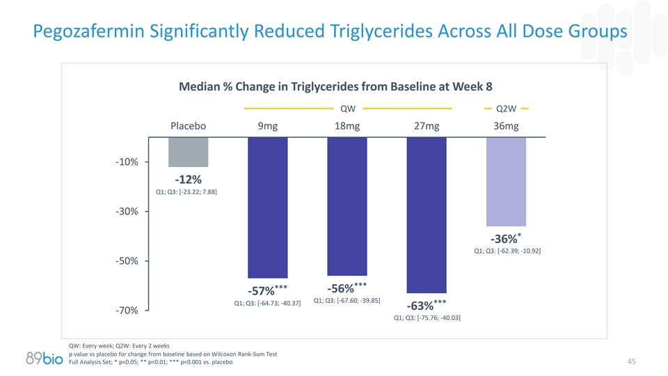 Pegozafermin显着降低所有剂量组的甘油三酯第8周QW Q2W安慰剂9mg18mg27mg36mg-10 %-12 % Q1甘油三酯较基线的中位%变化;Q3:[-23.22;7.88 ]-30 %*-36 % Q1;Q3:[-62.39;-10.92 ]-50 %******-56 %-57 % Q1;Q3:[-67.60;-39.85 ] Q1;Q3:[-64.73;-40.37 ]***-63 %-70 % Q1;Q3:[-75.76;-40.03 ] QW:每周;Q2W:每2周p值vs安慰剂基于Wilcoxon Rank-Sum测试全分析集的基线变化;*p < 0.05;**p < 0.01;***p < 0.001对比安慰剂45