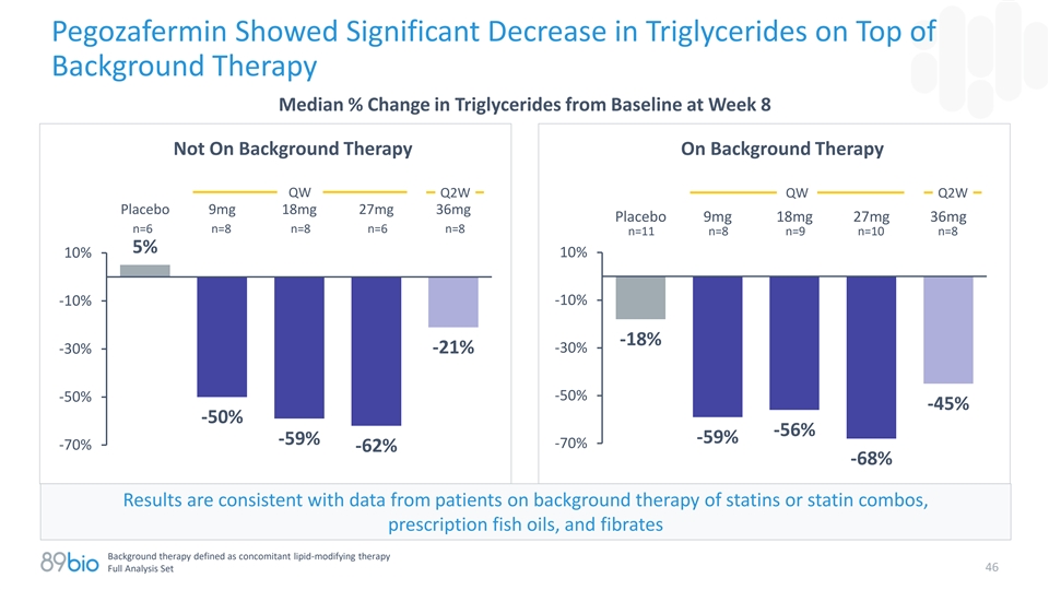 Pegozafermin在背景疗法之上显示甘油三酯显着下降第8周时甘油三酯与基线的中位%变化不在背景疗法上QW Q2W QW Q2W安慰剂9mg 18mg 27mg 36mg安慰剂9mg 18mg 27mg 36mg n = 6 n = 8 n = 8 n = 6 n = 8 n = 8 n = 11 n = 8 n = 9 n = 10 n = 85 10% 10%-10 %-10 %-18 %-30 %-21 %-50 %-50 %-45 %-50 %-56 %-59 %-59 %-70 %-70 %-62 %-68 %结果与他汀类药物或他汀类药物组合、处方鱼油背景疗法患者的数据一致,和贝特类背景疗法定义为伴随脂质修饰疗法46全分析集