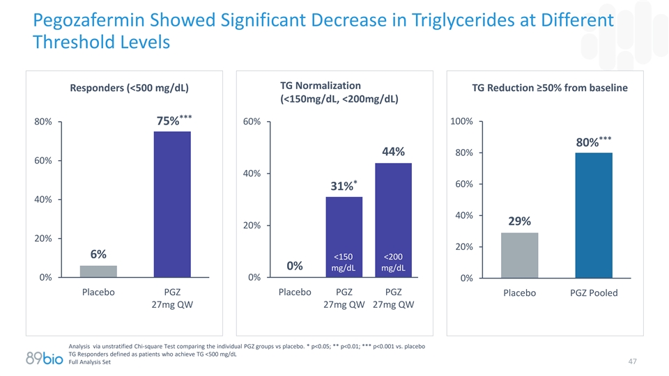 Pegozafermin显示在不同阈值水平下甘油三酯显著降低TG正常化TG较基线应答者降低≥ 50%(< 500mg/dL)(< 150mg/dL,< 200mg/dL)***60% 100% 80% 75%***80% 44% 80% 60% 40%*60% 31% 40% 40% 29% 20% 20% 20% 6% < 150 < 2000% mg/dL mg/dL 0% 0% 0%安慰剂PGZ安慰剂PGZ安慰剂PGZ通过未分层卡方试验比较个别PGZ组与安慰剂,汇集了27mg QW 27mg QW 27mg QW分析。*p < 0.05;**p < 0.01;***p < 0.001 vs.安慰剂TG应答者定义为达到TG < 500mg/dL的患者全分析集47