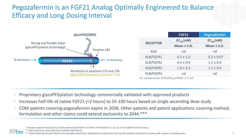Pegozafermin是一种FGF21类似物,优化设计用于平衡疗效和长给药间隔glycoPEG(20kD)FGF21 Pegozafermin EC(nM)EC(nM)5050强柔性接头受体均值± SD均值± SD.(糖聚乙二醇化技术)位置182 KLB nd nd KLB/FGFR1 4.5 ± 1.0 0.3 ± 0.07 N端C端FGF21 XX KLB/FGFR2 4.5 ± 0.9 1.1 ± 0.4 KLB/FGFR3 1.8 ± 0.31.2 ± 0.4 173位突变和176 KLB/FGFR4 nd nd(glycoPEG附着在173位)nd –未确定;rhFGF19 EC at FGFR4 = 1.7 ± 0.450 •专有糖聚乙二醇化技术经批准产品商业验证•基于单次递增剂量研究将原生FGF21的半衰期(< 2小时)提高到55-100小时•涵盖pegozafermin的COM专利将于2038年到期。涵盖方法、配方和其他权利要求的其他专利和专利申请可将排他性延长至2044年。****通过pERK功能测定在表达β-klotho和任何一种FGF受体1c、2c、3c或4的L6细胞中测量受体激动性**表格表示来自多个实验的平均数据4***到期日不会使任何可用的专利期限调整或延期生效,这些调整或延期可能可用并承担与未决案件相关的发行