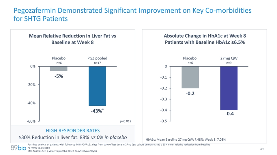 Pegozafermin在关键合并症方面表现出显着改善SHTG患者平均肝脂肪相对减少vs第8周基线HBA1c绝对变化第8周基线HBA1c ≥ 6.5%安慰剂PGZ合并安慰剂27mg QW n = 6 n = 17 n = 6 n = 90% 0-5 %-0.1-20 %-0.2-0.2-0.3-40 %*-0.4-43 %-0.4-60 % p = 0.012-0.5高反应率≥ 30%肝脏脂肪减少:88% vs安慰剂HBA1c:平均基线27 mg QW:7.48%;第8周:7.08%对27mg QW队列中随访MRI-PDFF ≤自最后一次给药之日起21天的患者的事后分析表明,平均相对减少从63%基线*p < 0.05 vs.安慰剂49 MRI分析集;基于ANCOVA分析的p值vs安慰剂