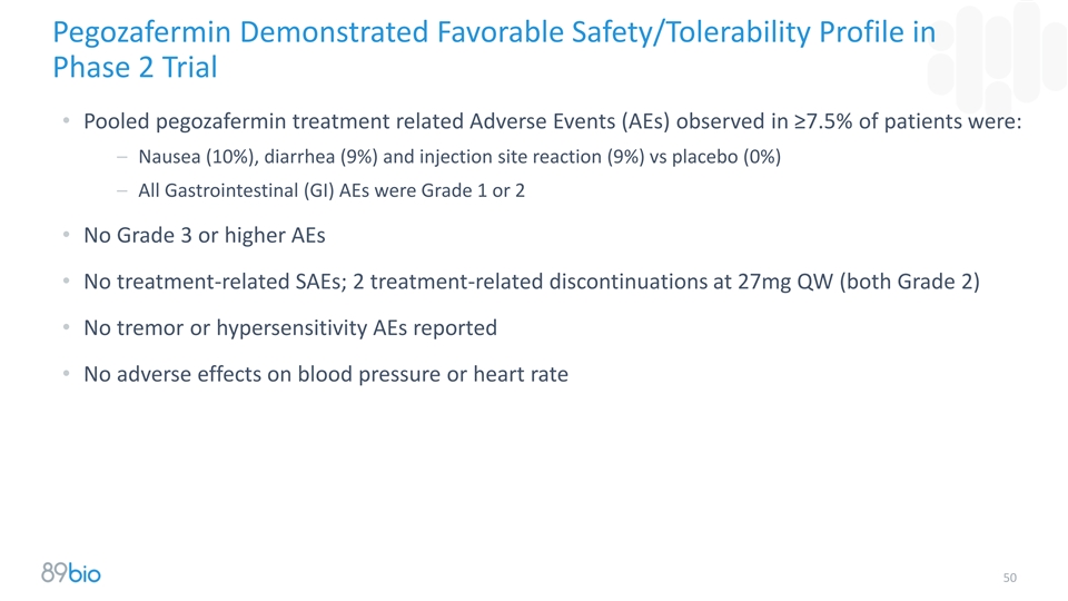 Pegozafermin在2期试验中表现出良好的安全性/耐受性•在≥ 7.5%的患者中观察到的与pegozafermin治疗相关的不良事件(AEs)的合并:–恶心(10%)、腹泻(9%)和注射部位反应(9%)与安慰剂(0%)–所有胃肠道(GI)AEs均为1级或2级•无3级或更高级别AEs •无治疗相关SAE;2次治疗相关的停药,剂量为27mg QW(均为2级)•无震颤或超敏AEs报告•无对血压或心率的不良影响50