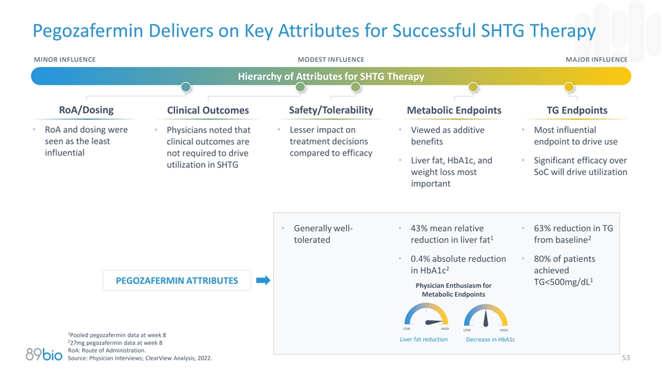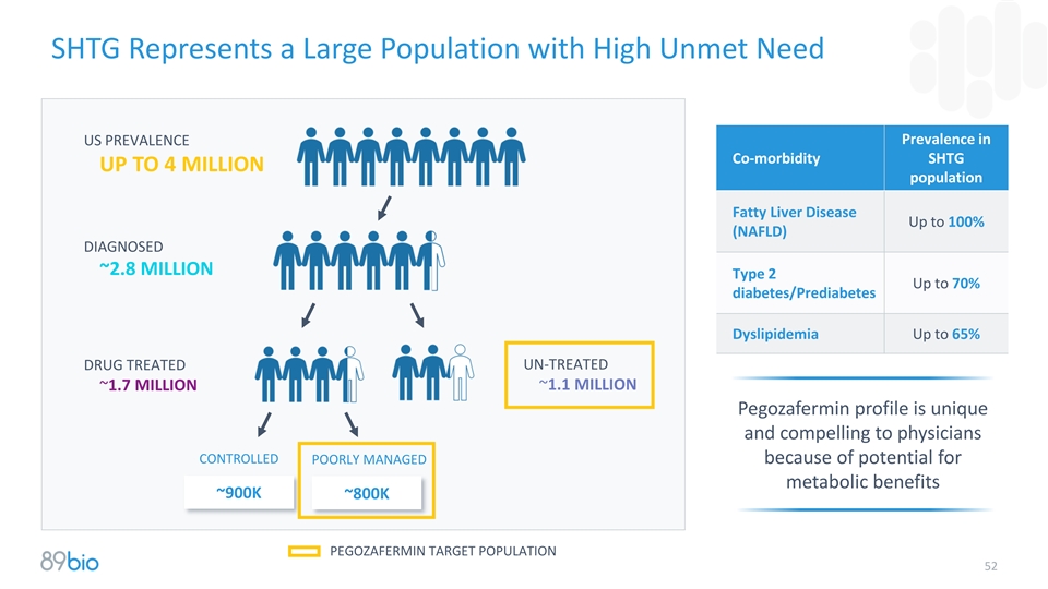 SHTG代表了美国未满足需求流行率高的大量人群合并症SHTG高达400万人群脂肪性肝病高达100%(NAFLD)诊断~280万2型高达70%糖尿病/前糖尿病血脂异常高达65%未治疗药物治疗~110万~170万Pegozafermin谱是独特的,对控制不当的医生来说很有吸引力,因为潜在的代谢益处~900k~800k PegoZafermin目标人群52