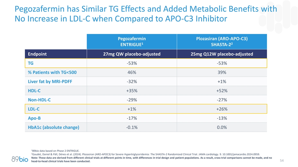 Pegozafermin与APO-C3抑制剂Pegozafermin Plozasiran(ARO-APO-C3)相比具有相似的TG效应,并增加了不增加LDL-C的代谢益处12输入SHASTA-2终点27mgQW安慰剂调整25mgQ12W安慰剂调整TG-53 %-53 %% TG < 50046% 39%肝脂肪MRI-PDFF-32 % + 1% HDL-C + 35% + 52%非HDL-C-29 %-27 % LDL-C + 1% + 26% APo-B-17 %-13 % HBA1c(绝对变化)-0.1 % 0.0% 1基于2期ENTRIGUG的89bio数据2 Gaudet,Daniel & P á ll,D é nes et al.(2024)。Plozasiran(ARO-APOC3)治疗严重高甘油三酯血症:SHASTA-2随机临床试验。JAMA心脏病学。9.10.1001/jamacardio.2024.0959。注:这些数据来源于不同时点的不同临床试验,在试验设计和患者人群方面存在差异。因此,无法进行跨试验比较,没有进行54项头对头临床试验。