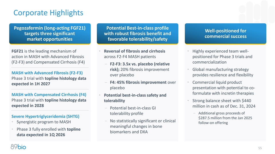 公司亮点Pegozafermin(长效FGF21)潜在的同类最佳概况为具有强大纤维化益处和商业成功市场机会的目标三做好准备有利的耐受性/安全性FGF21是•纤维化和肝硬化逆转的主要机制•在F2-F4 MASH患者的MASH中具有高度经验的团队良好行动,定位于3期试验和(F2-F3)和代偿性肝硬化(F4)商业化– F2-F3:3.5x vs.安慰剂(相对风险);20%的纤维化改善•与安慰剂相比,具有晚期纤维化(F2-F3)的全球制造战略MASH提供了韧性具有顶线组织学数据的和灵活性的3期试验– F4:纤维化改善45%比•商业液体产品预计在2027年上半年进行安慰剂展示,有可能与肠促胰岛素疗法MASH伴代偿性肝硬化(F4)共同配制•潜在的同类最佳安全性和具有顶线组织学数据耐受性的3期试验•强劲的资产负债表,预计截至12月31日的现金为4.4亿美元,2028,2024年–潜在同类最佳GI –从2025年1月开始的耐受性概况严重高甘油三酯血症(SHTG)的额外总收益2.875亿美元–没有统计学意义或临床意义•为MASH后续提供有意义的骨骼变化的协同计划•预计在2026年第一季度完全注册顶线生物标志物和DXA数据的第3阶段55