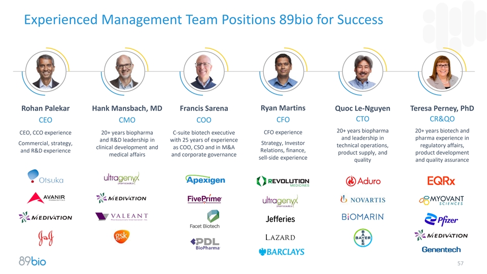 经验丰富的管理团队将89bio定位为成功之举Ryan MartinsHank Mansbach,MD Francis Sarena Quoc Le-Nguyen Teresa Perney,PhD CTO CRR & QO CEO CMO COO CFO 20 +年生物制药20 +年生物技术和首席执行官,CCO经验20 +年生物制药C-Suite biotech执行CFO经验和领导制药经验和研发领导在战略、投资者商业、战略、技术运营、监管事务、临床开发以及担任COO、CSO和并购关系、财务、研发经验产品供应,以及产品开发医疗事务和公司治理卖方经验质量和质量保证57