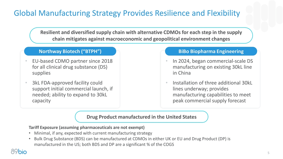 全球制造战略提供韧性和灵活性为供应链中的每个步骤提供替代CDMO的具有韧性的多元化供应链缓解了宏观经济和地缘政治环境变化的影响Northway Biotech(“BTPH”)BIBO Biopharma Engineering •自2018年以来位于欧盟的CDMO合作伙伴• 2024年,开始在中国现有的30kL线供应上为所有临床药物(DS)制造提供商业规模的DS • 3kL FDA批准的设施可以•安装三个额外的30kL支持初步商业启动,如果生产线正在进行中;提供所需;有能力扩展到30kL制造能力以满足产能峰值商业供应预测美国制造的药物产品关税风险(假设药品不豁免)•当前制造战略预期的最小(如果有的话)•大宗药物物质(BDS)可以在英国或欧盟的CDMO生产,药物产品(DP)在美国制造;BDS和DP都是COGS的重要百分比5