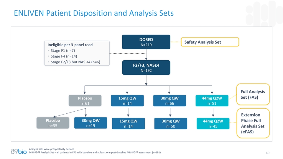 ENLIVEN患者处置和分析集DOSED安全性分析集不合格,每3个面板读数N = 219 • F1阶段(n = 7)• F4阶段(n = 14)• F2/F3阶段,但NAS < 4(n = 6)F2/F3,NAS ≥ 4 n = 192全分析集(FAS)安慰剂15mg QW 30mg QW 44mg Q2W n = 61 n = 14 n = 66 n = 51延长安慰剂30mg QW期全15mg QW 30mg QW 44mg Q2W n = 35 n = 19 n = 14 n = 50 n = 45分析集(eFAS)分析集前瞻性定义MRI-PDFF分析集=具有基线和60