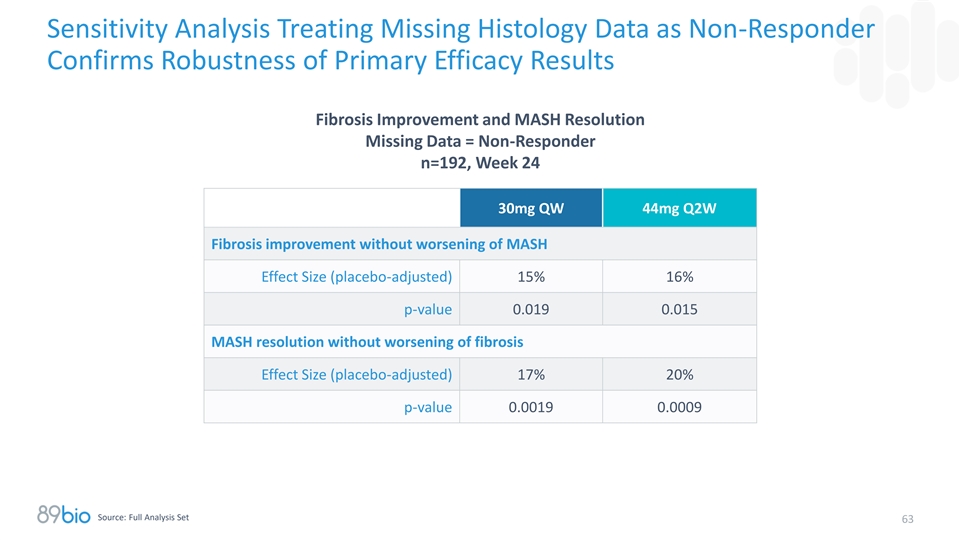 将缺失的组织学数据视为无反应者的敏感性分析证实了主要疗效结果的稳健性纤维化改善和MASH分辨率缺失数据=无反应者n = 192,第24周30mg QW 44mg Q2W纤维化改善而MASH效应大小不恶化(安慰剂调整)15% 16% p值0.01 90.015 MASH分辨率而不恶化纤维化效应大小(安慰剂调整)17% 20% p值0.00 190.0009来源:全分析集63