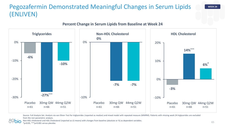 第24周Pegozafermin在第24周显示HBA1c(ENLIVEN)变化明显低于基线总人口基线HBA1c ≥ 6.5%安慰剂30mg QW 44mg Q2W安慰剂30mg QW 44mg Q2W n = 61 n = 66 n = 51 n = 31 n = 32 n = 250.0 0.0 0.0 0.0-0.1-0.1-0.2-0.2-0.2-0.3-0.2-0.4-0.3-0.4*-0.5 -0.3**-0.5-0.4-0.6来源:针对总体人群或基线HBA1c ≥ 6.5%的FAS的完整分析集。通过MMRM进行分析。64*p < 0.05,**p < 0.01对比安慰剂。