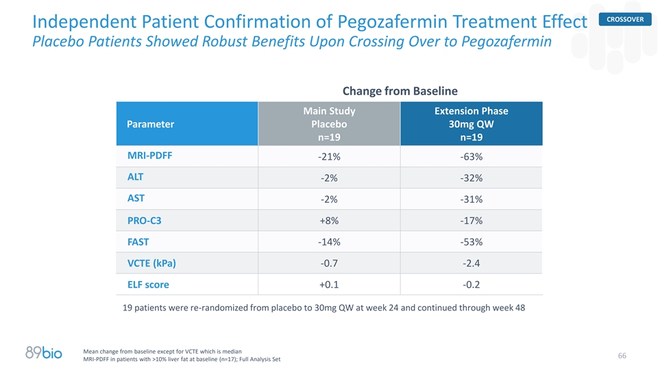 CrossSOVER独立患者确认Pegozafermin治疗效果安慰剂患者在从基线跨越到Pegozafermin变化时显示出强大的益处主要研究扩展阶段参数安慰剂30mg QW n = 19 n = 19 MRI-PDFF-21 %-63 % ALT-2 %-32 % AST-2 %-31 % PRO-C3 + 8%-17 % FAST-14 %-53 % VCTE(kPA)-0.7-2.4 ELF评分+ 0.1-0.2 19名患者在第24周从安慰剂重新随机分配到30mg QW,并持续到第48周,在基线时肝脂肪> 10%的患者中,除VCTE为中位66 MRI-PDFF(n = 17)外,均显示出与基线的平均变化;全分析集