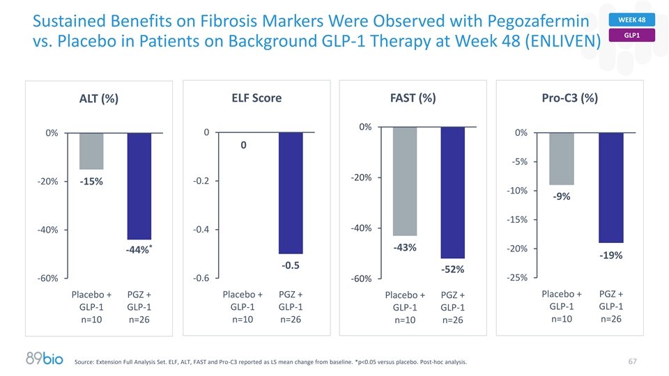 第48周在接受背景GLP-1治疗的患者中使用Pegozafermin GLP1与安慰剂观察到对纤维化标志物的持续益处第48周(ENLIVEN)ELF评分FAST(%)Pro-C3(%)ALT(%)0% 00% 0% 0-5 %-20 %-0.2-20 %-15 %-10 %-9 %-15 %-40 %-40 %-0.4*-43 %-20 %-44 %-19 %-0.5-52 %-60 %-0.6-25 %-60 %安慰剂+ PGZ +安慰剂+ PGZ +安慰剂+ PGZ + PLZ + GLP-1 GLP-1 GLP-1 GLP-1 GLP-1 GLP-1 GLP-1 GLP-1 n = 10 n = 26 n = 10 n = 26 n = 26 n = 26 n = 26 n = 26 n = 26 n = 26 n = 26 n = 26 n = 26 n = 26 n = 26 n = 26 n = 26 n = 26 n = 26 n = 26 n = 26 n = 26 n = 26 n = 26 n = 26 n = 26 n = 26 n = 26 n = 26 n = 26 n = 26 n = 26 n = 26 n =ELF、ALT、FAST和Pro-C3报告为LS较基线的均值变化。*p < 0.05对比安慰剂。事后分析。67