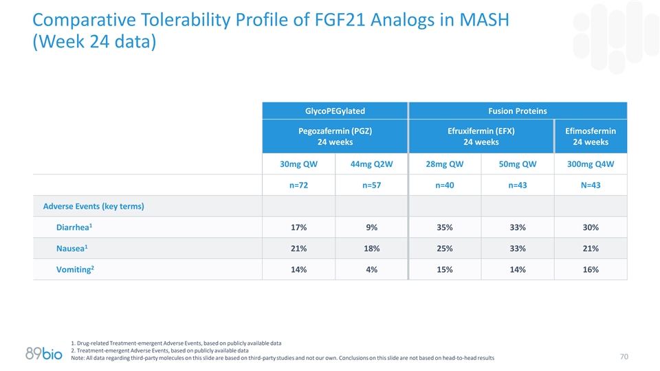 MASH中FGF21类似物的比较耐受性曲线(第24周数据)糖聚乙二醇化融合蛋白Pegozafermin(PGZ)Efruxifermin(EFX)Efimosfermin 24周24周24周30mg QW 44mg Q2W 28mg QW 50mg QW 300mg Q4W n = 72 n = 57 n = 40 n = 43 n = 43不良事件(关键项)1腹泻17% 9% 35% 33% 30% 1恶心21% 18% 25% 33% 21% 2呕吐14% 4% 15% 14% 16% 1。药物相关治疗-紧急不良事件,基于公开数据2。治疗紧急不良事件,基于公开数据70注:本幻灯片上有关第三方分子的所有数据均基于第三方研究,而不是我们自己的。关于这张幻灯片的结论不是基于头对头的结果