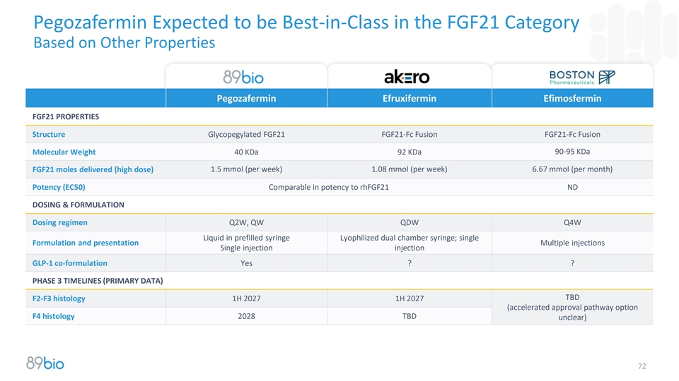 Pegozafermin基于其他特性有望在FGF21类别中获得同类最佳Pegozafermin Efruxifermin Efimosfermin FGF21特性Structure糖化FGF21 FGF21-FC融合FGF21-FC融合90-95 KDa分子量40KDa 92 KDa FGF21递送摩尔(高剂量)1.5mmol(每周)1.08mmol(每周)6.67mmol(每月)效力(EC50)与rhFGF21 ND给药&配方给药方案Q2W、QW QDW Q4W液体在预充式注射器冻干双腔注射器中的效力相当;?Phase 3 Timelines(Primary Data)TBD F2-F3组织学1H 2027 1H 2027(accelerated approval pathway option F4组织学2028 TBD unclear)72