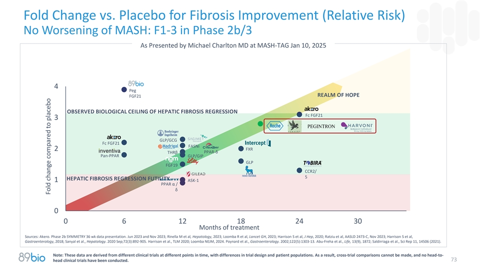 Fold change vs. Placebo for fibrosis improvement(relative risk)MASH No worsening of mASH:F1-3 in phase 2b/3 as presented by Michael Charlton MD at MASH-TAG Jan 10,20254 peg realm of hope FGF21 observed biological ceiling of hepatic fibrosis regression fc FGF21 3GLP/GCG Fc FGF21 FASNi FXR 2 PPAR-δ THR β pan-PPAR GLP/GIP GLP FGF19 CCR2/5 Hepatic fibrosis regression futility 1 ASK-1 PPAR α/δ 00612182430个月治疗来源:2b期SYMETRY36周数据演示。2023年6月和2023年11月;Rinella M等人,Hepatology,2023;Loomba R等人,Lancet GH,2023;Harrison S等人,J Hep,2020;Ratziu等人,AASLD 2473-C,2023年11月;Harrison S等人,Gastroenterology,2018;Sanyal等人,Hepatology。2020年9月;72(3):892-905。Harrison等,TLM 2020;Loomba NEJM,2024。Poynard et al.,Gastroenterology。2002;122(5):1303-13.Abu-Freha et al.,Life,13(9),1872;Saldirriaga et al.,Sci Rep 11,14506(2021)。注:这些数据来源于不同时点的不同临床试验,在试验设计和患者人群方面存在差异。因此,无法进行跨试验比较,也没有进行过头-73头临床试验。与安慰剂相比变化倍数
